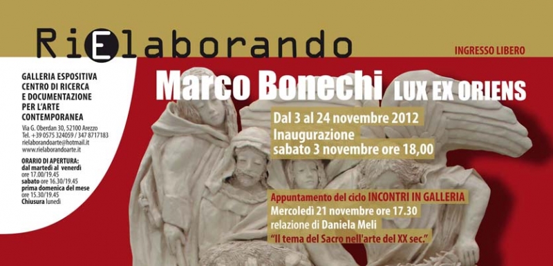 Si apre sabato 3 novembre, alle ore 18.00, la mostra “Lux ex oriens” del pittore e scultore Marco Bonechi, presso la galleria RiElaborando, via Oberdan 30 Arezzo. L'esposizione di terracotte invetriate ispirate a soggetti sacri e di dipinti d'impronta evocativa ed allegorica, curata da Daniela Meli, resterà visitabile fino al 24 novembre, ad ingresso libero, secondo i seguenti orari di apertura: da martedì a venerdì dalle 17.00 alle 19.45; sabato dalle 16.30 alle 19.45; prima domenica del mese dalle 15.30 alle 19.45; chiuso il lunedì. Inoltre, sempre negli stessi locali di via Oberdan, mercoledì 21 novembre, alle ore 17.30, si svolgerà la relazione “Il tema del Sacro nell'arte del XX sec.”, a cura di Daniela Meli, appuntamente facente parte del ciclo “Incontri in galleria”, aperto alla cittadinanza, fino ad esaurimento posti. A corredo dell'evento espositivo, al fine di estendere e favorire la fruizione dell'opera di Bonechi, un piccolo e selezionato nucleo di pezzi dell'artista sarà visibile anche presso “Spazio Lebole” di Nicoletta Lebole, via Margaritone 27, Arezzo. Una brochure di presentazione critica, con interventi a firma di Daniela Meli e Liletta Fornasari, accompagnerà il repertorio in esposizione e sarà disponibile per il pubblico interessato. Artista toscano, residente a Figline Valdarno, Marco Bonechi fin dall'esordio, avvenuto negli anni Settanta, ha espresso una ricercata vena creativa tesa a trarre spunti di riflessione dalla migliore tradizione figurativa europea. Dedicandosi parallelamente alla pittura, all'incisione ed alla modellazione in terracotta invetriata, ha rivisitato il repertorio immaginifico classico e lo ha riproposto in chiave simbolica, al fine di suscitare ulteriori riflessioni. Oramai celebri sono i suoi pastiche di rovine, reperti archeologici, pietre, colonne, capitelli e così via, proiettati in un contesto naturale mediterraneo, luminoso ed immobile. Così come, altrettanto noti risultano i suoi scorci architettonici dall'aurea metafisica o surreale, quali “costruzioni ideali” sospese nel tempo. Questi generi pittorici ideati da Bonechi traducono metaforicamente l'umana aspirazione ad un ordine superiore di bellezza e di armonia assoluta e l'intento di mantenere viva l'attenzione sui valori del passato per rinnovare l'arte e proiettarla verso il futuro. L'artista, quindi, allude ad una possibile rinascita spirituale e culturale, ad una civiltà artistica da ricostituire. E, per questo, analogamente, nell'affrontare il tema Sacro, spesso ricorre all'immagine della sacra Famiglia in sosta in rifugi di fortuna nei pressi di rovine classiche: allegoria della fine di un'epoca (paganesimo) e dell'inizio di una nuova era (cristianesimo). In ogni caso, degne di grande apprezzamento per l'indubbia maestria appaio le articolate e complesse opere plasmate in terraccotta: Annunciazione, Visitazione, Natività, Adorazione dei Magi, sono solo alcuni dei soggetti affrontati, sia nelle piccole che nelle grandi dimensioni, ricollegandosi direttamente alla tradizione robbiana. In definitiva Bonechi, con la sua attività, risale alle radici più profonde della nostra cultura e, spaziando tra grafica, pittura e scultura, rilancia il concetto rinascimentale di arte, intesa come esercizio intellettuale e tecnico, come espressione di ideali e di abilità innate, attenendosi ai canoni estetici del bello: tutti principi, questi, messi largamente in discussione nell'epoca odierna.