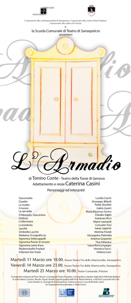 Dopo i successi conseguiti da “L'armadio”, spettacolo realizzato dalla Scuola Comunale di Teatro di Sansepolcro diretta da Caterina Casini, nei giorni 11 e 14 marzo, il lavoro sarà replicato martedì 25 marzo alle ore 10.00 al Teatro Comunale di Pistrino con la collaborazione dell'assessorato alla cultura del comune di Citerna. Si tratta di un testo per ragazzi: le avventure di Giacometta, bambina che attraversa realtà e fantasia per trovare se stessa.