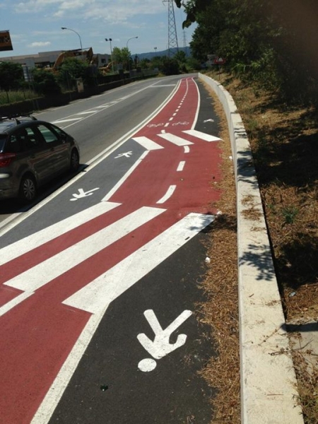 Sembra un fotomontaggio. Una di quelle foto taroccate per far sorridere. In realtà è stata postata su Facebook e ritrae la realtà . Basta andare in via Calamandrei per trovarsi davanti quanto si vede nell'immagine e chiedersi, inevitabilmente, ma che cosa è? Se sono a piedi devo attraversare la pista ciclabile? Ma perchè? E così il passaggio per le bici di via Calamandrei torna di nuovo sotto ai riflettori. Stavolta non perchè finisce sulla carreggiata, ma per queste complicate indicazioni ....