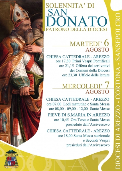 Mercoledì 7 agosto, Solennità liturgica di san Donato, sono previste in Cattedrale alle 7 le Lodi mattutine seguite e la Messa. L'eucaristia verrà ripetuta anche alle 8, alle 9 e alle 12.