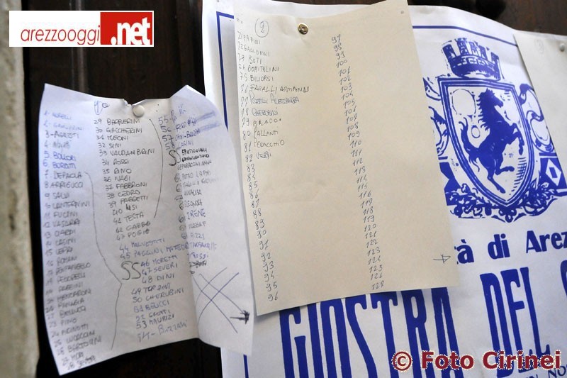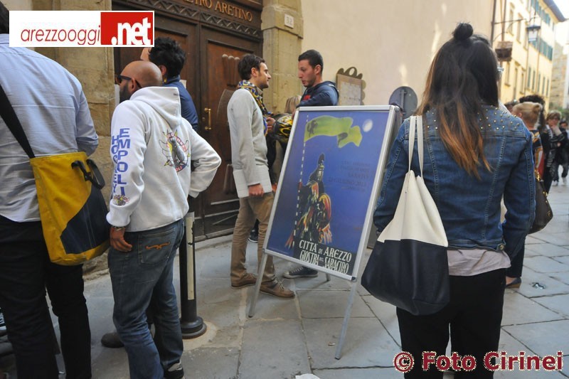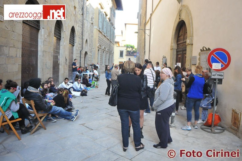 Hanno passato la notatta davanti alla biglietteria per accaparrarsi i primi biglietti della Giostra. Ed il tagliando numero 1 è andato a Maria Rosa Morelli, una veterana di questa "singolare gara". La donna, orginaria di Faenza, da trent'anni vive ad Arezzo e si è appassionata al Saracino dove ritrovò un fantino della sua città d'origine, il celebre Franco Ricci. E così ha raccontato di essere riuscita a far appassionare anche i suoi figli allo spettacolo della Giostra. Si è appostata davanti alla Bicchieraia già da ieri ed ha atteso, determinata come sempre. E fuori non c'era solo lei. Anche i quartieristi si sono accampati davanti alla biglietteria per tutta la notte. Tavolini e coperte hanno trascorso le ore in allegria e senza mollare il posto. Poi stamani si sono svegliati concedendosi anche qualche pasticcino, e l'hanno pure offerto ai turisti che passavano incuriositi.