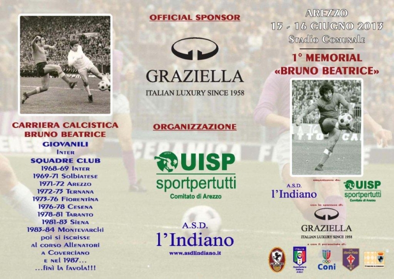 Graziella Group Italian Luxury è lieta di annunciare la propria partecipazione in veste di Sponsor Ufficiale al 1°Memorial "Bruno Beatrice" manifestazione commemorativa dell'ex calciatore, che si terrà ad Arezzo il 15 ed il 16 giugno.