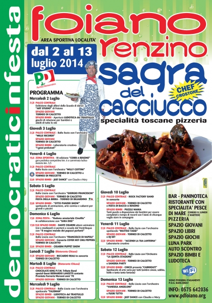 Si terrà dal 2 a al 13 luglio presso l’area attrezzata di Renzino la festa del PD di Foiano della Chiana (Ar). Oltre alla specialità del cacciucco preparata dallo chef Crostone, si potranno degustare tante altre prelibatezze e intrattenersi nella fresca area verde, per il ballo liscio, i concerti rock, e altre iniziative in cartellone. Adiacenti al ristorante e alla pizzeria saranno presenti la libreria, lo spazio giochi, il luna park, lo spazio bimbi, la ludoteca, la babydance e lo spazio dibattiti.